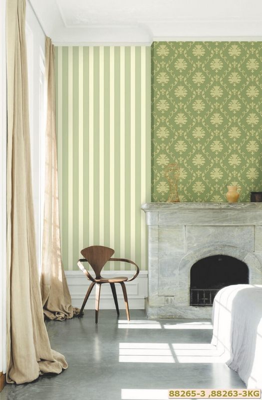. Hợp tác giữa giấy dán tường xanh trắng và giấy dán tường hoa văn tân cổ điển mang lại sự cân bằng và phù hợp với nhiều không gian.