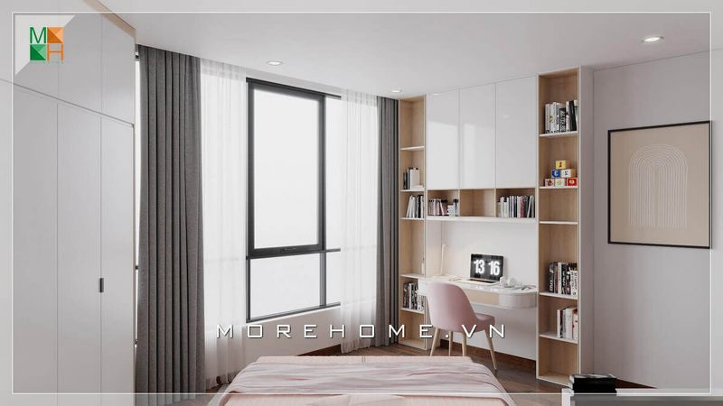 Mẫu phòng ngủ tông màu trắng trẻ trung, với bàn học kết hợp cùng giá sách giúp tiết kiệm diện tích sử dụng, cùng với cửa sổ lớn với rèm che màu xám tạo điểm nhấn làm cho căn phòng trở nên rộng rãi và thoáng mát hơn.