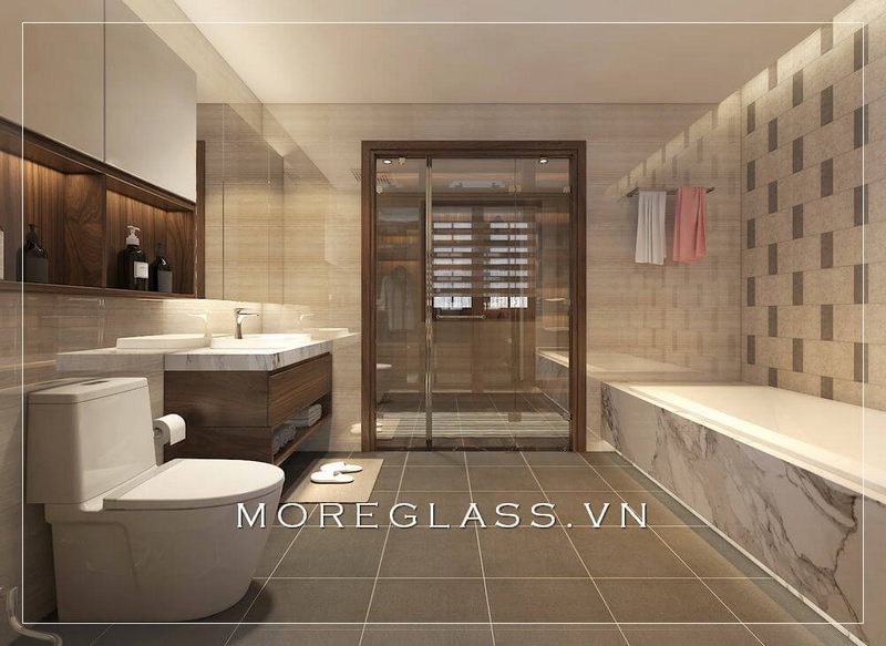 Mẫu thiết kế nội thất phòng tắm cao cấp được sắp đặt gọn gàng với các ngăn nắp và gạch ốp tường màu sáng tươi.