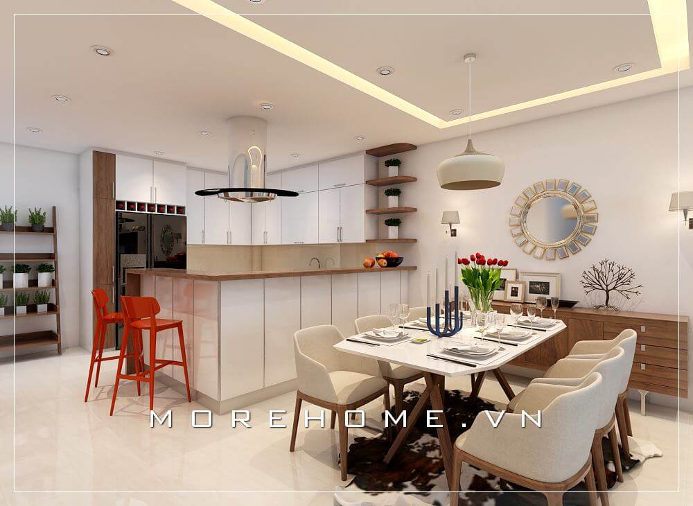 Thiết kế nội thất phòng ăn chung cư hiện đại, sử dụng các đồ vật trang trí tạo ánh sáng giúp căn phòng sáng và thoáng mát hơn